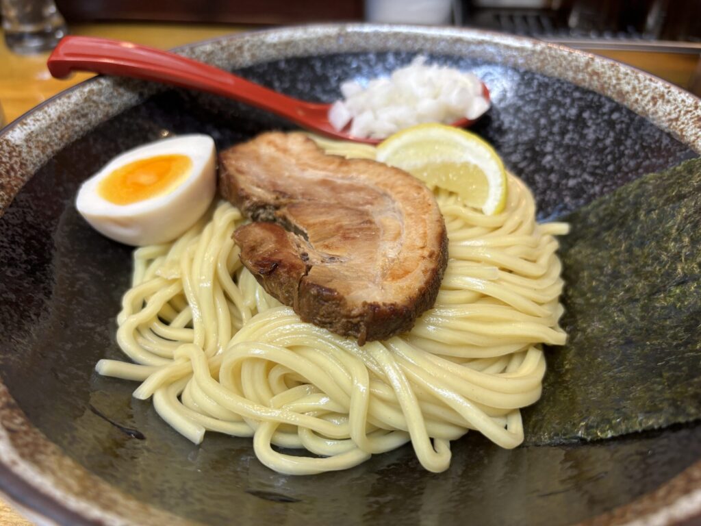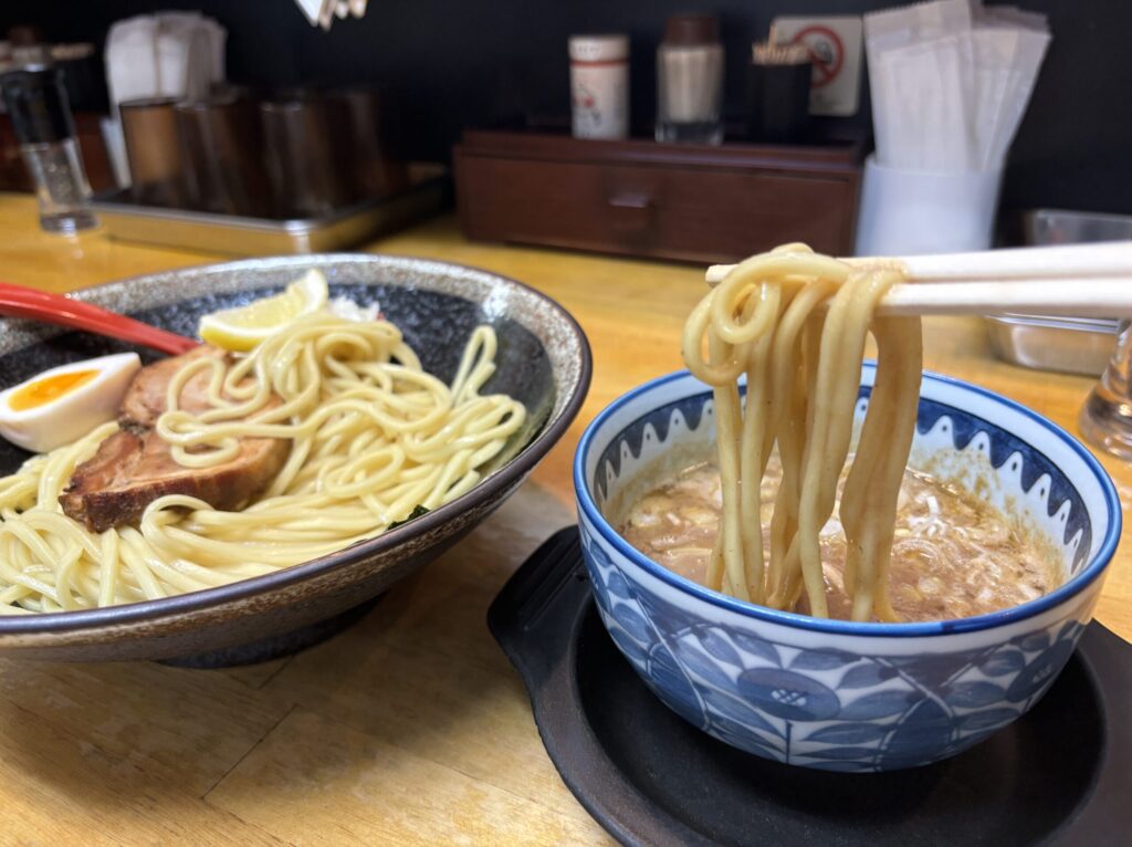麺は極太ストレート麺で、表面にツヤがあり、モチモチ感が抜群。小麦の香りも豊かで、麺だけで食べても美味しく、スープとの絡みも良好。一口ごとにしっかりとした満足感が広がります。つけ麺ならではの麺とスープの相性が際立つ一杯です。