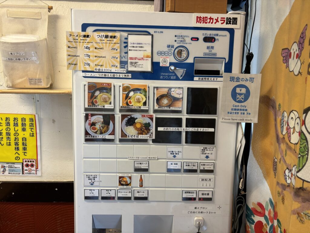 注文は食券制で現金のみ対応。つけ麺・ラーメンともに、同料金で並・中・大盛りが選べるサービスも嬉しいポイントです。