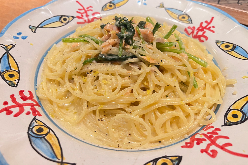まろやかなクリームソースにレモンの爽やかな酸味が重なり、サーモンの旨みとほうれん草の香りを引き立てます。ひと口食べると、ふわっと広がるレモンの香りとやさしい塩気が絶妙で、思わず笑みがこぼれるおいしさです。