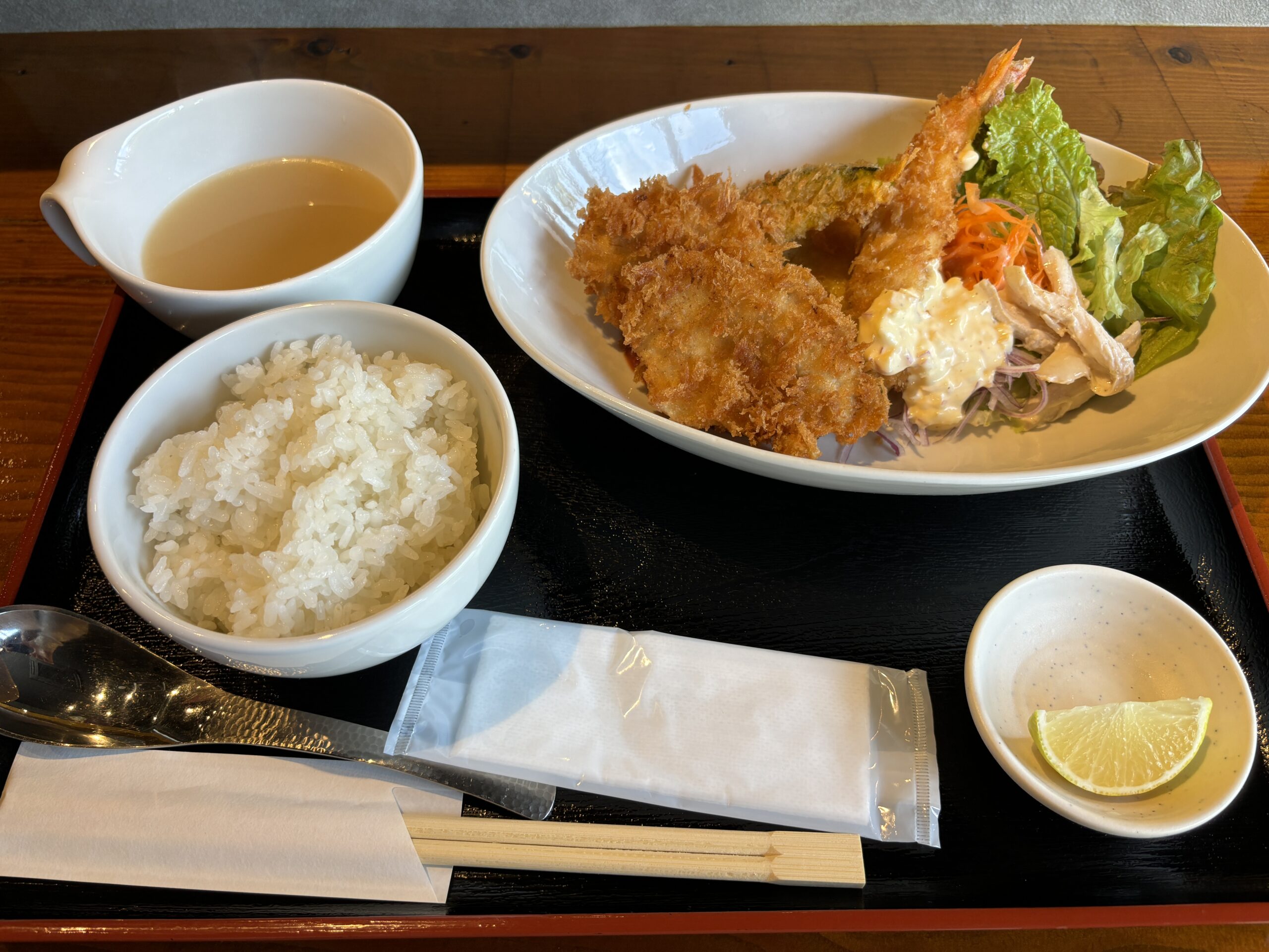 おすすめは、ランチタイム限定の「Aコンビ」(1,480円)。チキンカツ、エビフライ、季節の野菜フライが彩りよく盛り付けられ、見た目にも食欲をそそります。