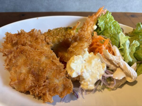 特にチキンカツはふわふわとやわらかく、サクッと軽やかな衣の中から肉汁がじゅわっと広がる絶品。ぷりっとしたエビフライには、自家製のタルタルソースがたっぷり添えられ、口の中でまろやかに溶け合います。