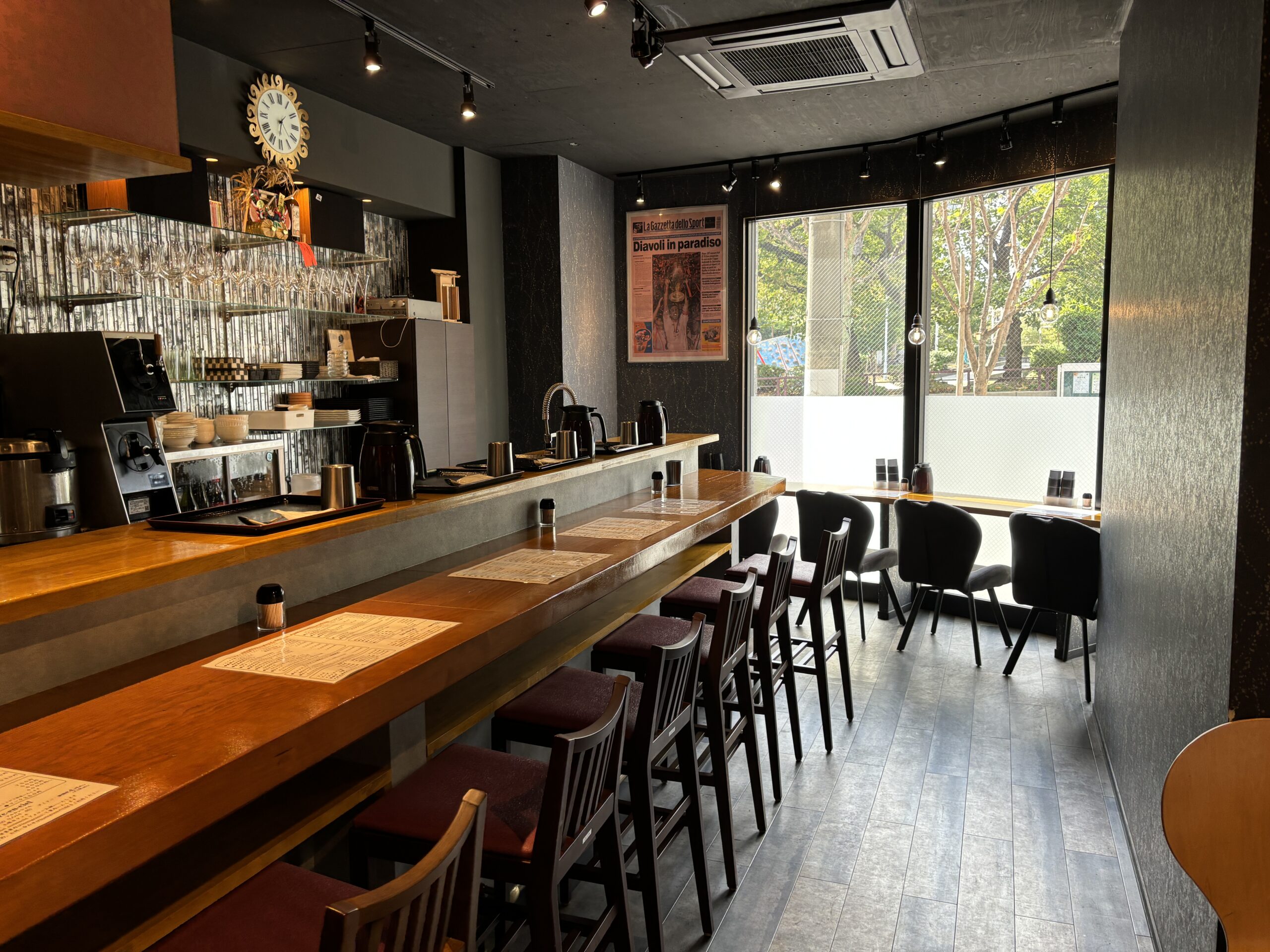 店内に入ると、木の温もりを感じるカウンター席が印象的。やわらかな照明と大きな窓から差し込む自然光が心地よく、昼は明るく開放的、夜はしっとり落ち着いた雰囲気に変わります。