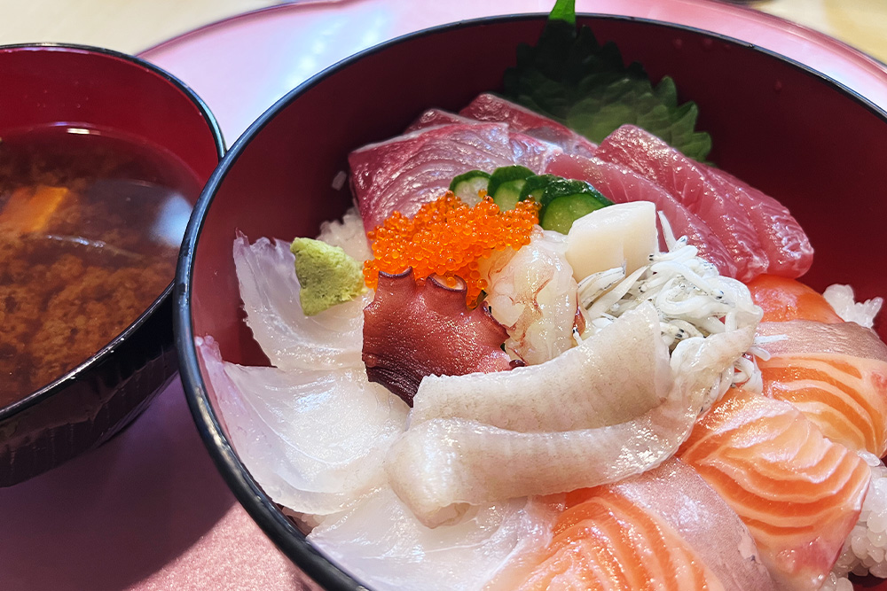 数量限定のため、訪問の際は早めの時間が狙い目です。丼の上には、鯛やサーモン、マグロなど旬の魚介が美しく盛り付けられ、見た目からも贅沢感が漂います。どのネタも新鮮そのもの。ひと口ごとに異なる味わいが広がり、自然と笑みがこぼれました。