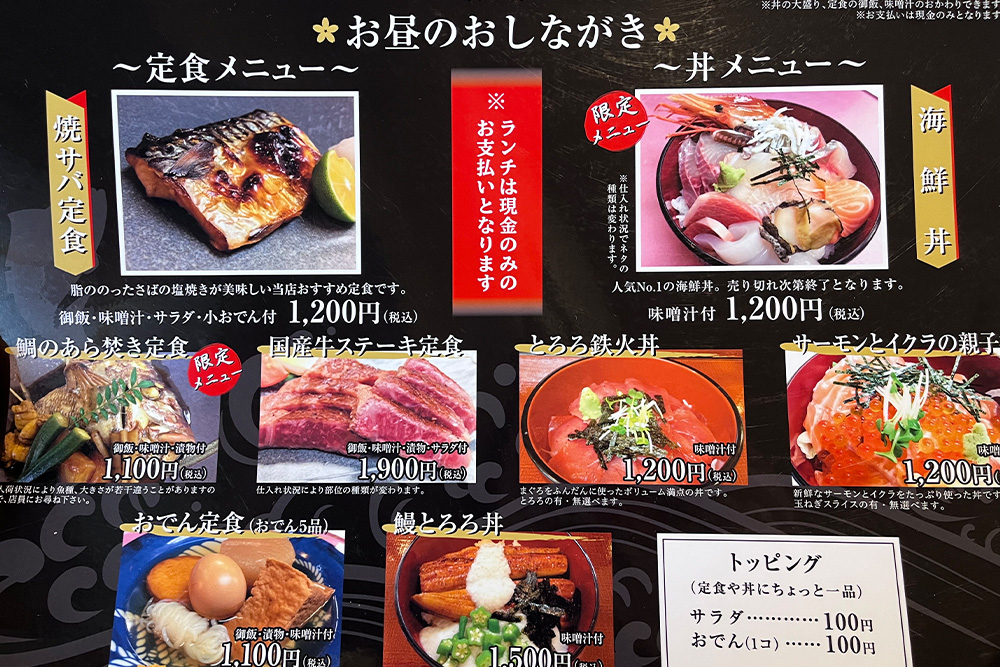 夜は居酒屋としても営業しており、旬の刺身や煮付け、おでんなど、お酒と一緒に楽しめるメニューが充実。仕事帰りにふらりと立ち寄って、軽く一杯…そんな過ごし方にもぴったりです。22時半まで営業しているので、ゆったりと過ごせるのも嬉しいところ。