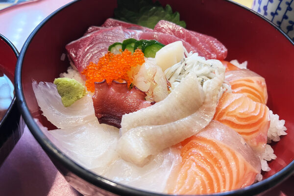 数量限定のため、訪問の際は早めの時間が狙い目です。丼の上には、鯛やサーモン、マグロなど旬の魚介が美しく盛り付けられ、見た目からも贅沢感が漂います。どのネタも新鮮そのもの。ひと口ごとに異なる味わいが広がり、自然と笑みがこぼれました。