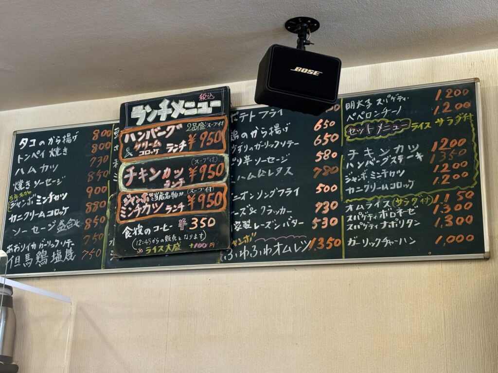 看板メニューは「ジャンボミンチカツランチ」(950円)。