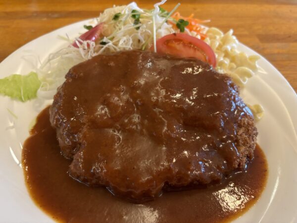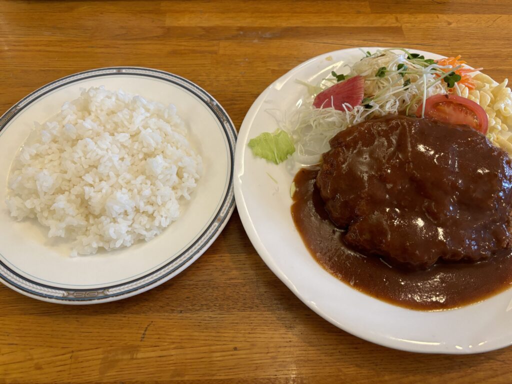 そして、メインのミンチカツが運ばれてくると、その大きさに思わず笑みがこぼれます。皿いっぱいに広がるボリューム満点のカツには、たっぷりのデミグラスソース。しっとりとした食感の中に肉のうまみが感じられ、濃厚なソースの深いコクが合わさって、食べるほどにおいしさが増していきます。