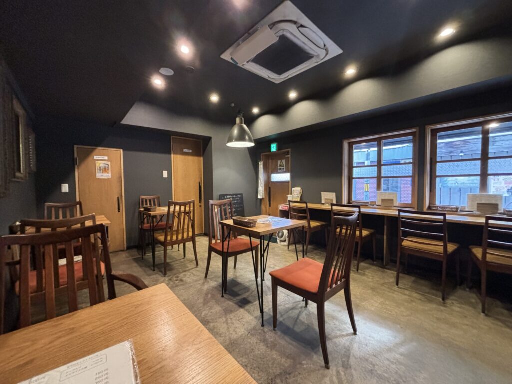 全体に落ち着いた雰囲気があり、食事の時間をゆっくりと楽しめる空間です。清潔感があり、ほどよい広さの中で心地よいひとときを過ごせます。