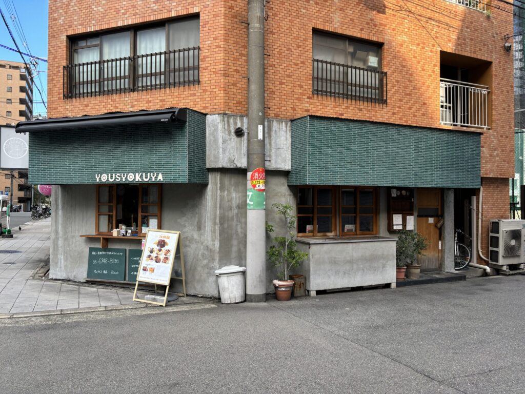 大阪メトロ天満橋駅から徒歩5分ほど。レンガ造りの建物の1階にある「洋食屋」は、深緑のタイルが印象的な洋食店です。落ち着いた佇まいの外観で、ガラス越しに見える店内もやさしい空気に包まれています。