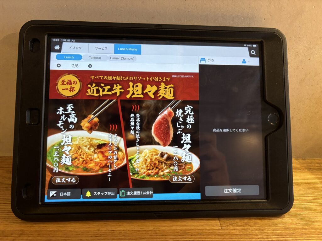 そんな天幕でランチとして人気を集めているのが「究極の焼きしゃぶ担々麺」(1380円)。湯気とともに広がる香り、鮮やかな色合いが目を引く一杯で、やわらかく焼き上げた近江牛が贅沢に盛られています。