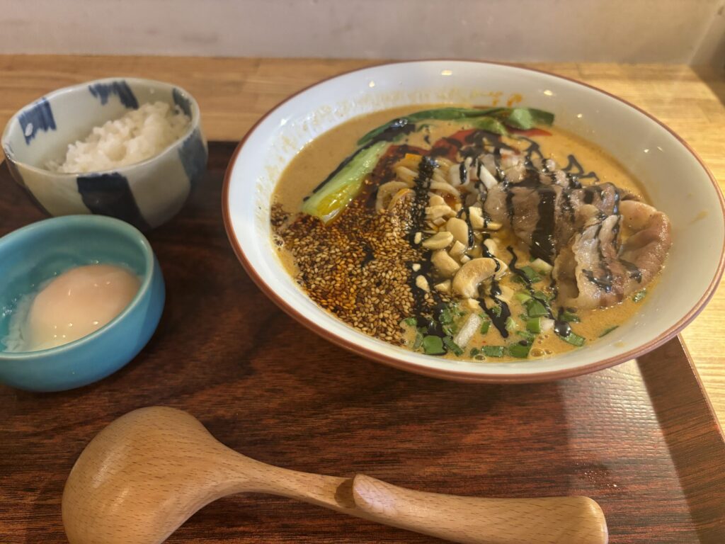 口に運ぶと脂の甘みがふわっと広がり、濃厚な担々スープと合わさることで奥行きのある味わいが生まれます。ごまの香ばしさ、黒マー油のコク、花椒のほのかな刺激が重なり、麺と絡めるたびにさまざまな表情を見せてくれます。