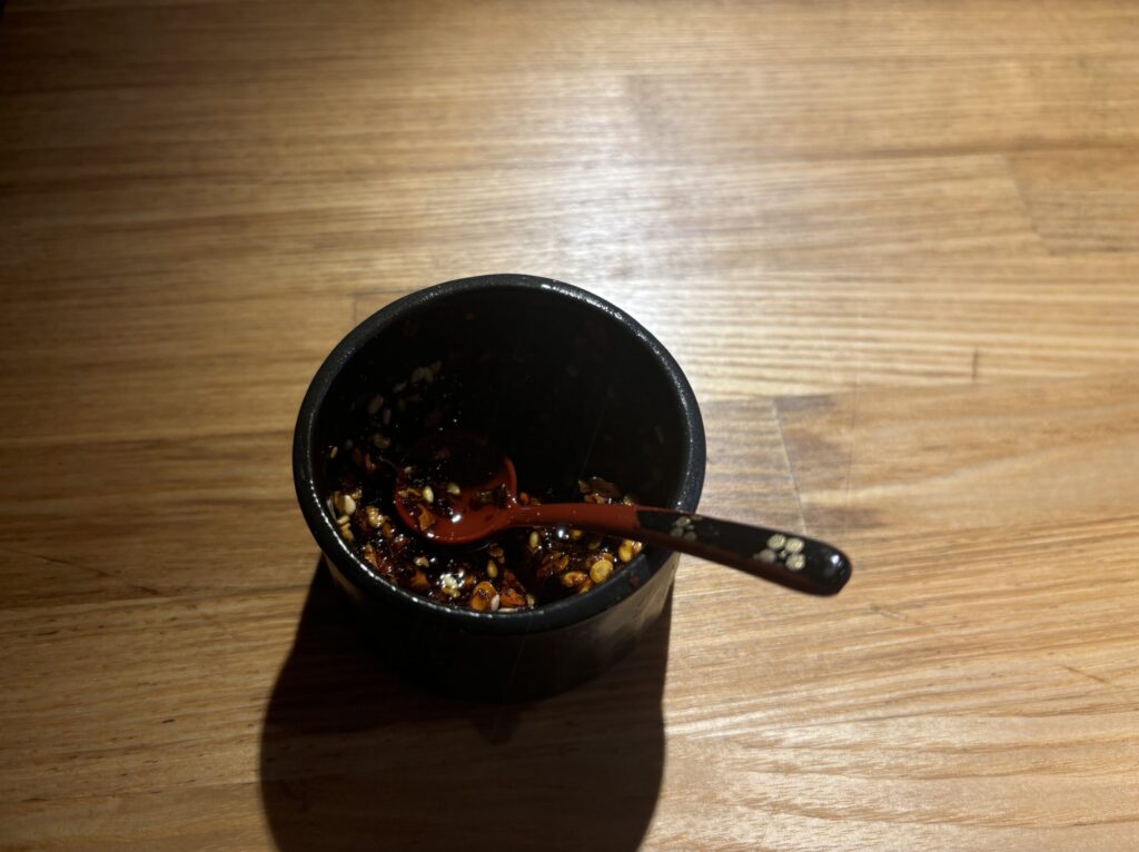 途中で加える「山椒ラー油」もぜひ試してほしい味変です。ひとさじで香りが立ち、スープが軽やかに締まるような印象に変化します。辛さよりも香りの余韻を楽しめるタイプで、最後まで飽きずに食べ進められます。