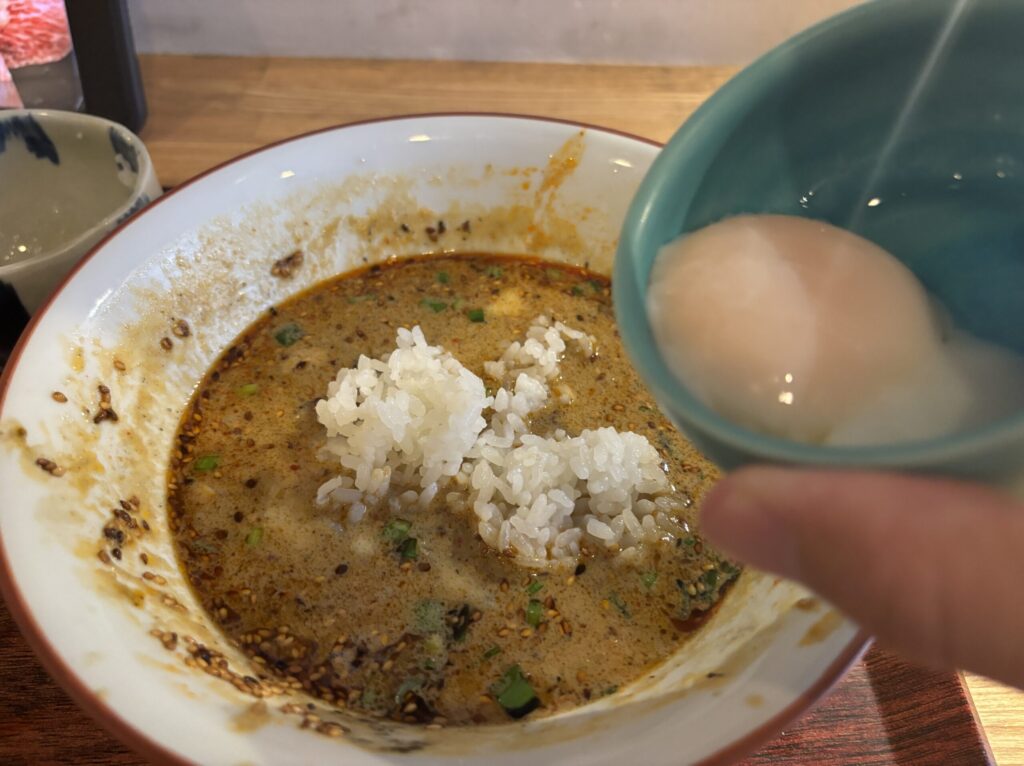 締めには、残ったスープをご飯と温泉卵でいただく“リゾット風の〆”がおすすめです。スープの旨みをご飯がしっかり受け止め、とろりとした卵が全体をまとめてくれるため、最後の一口まで満足感が続きます。