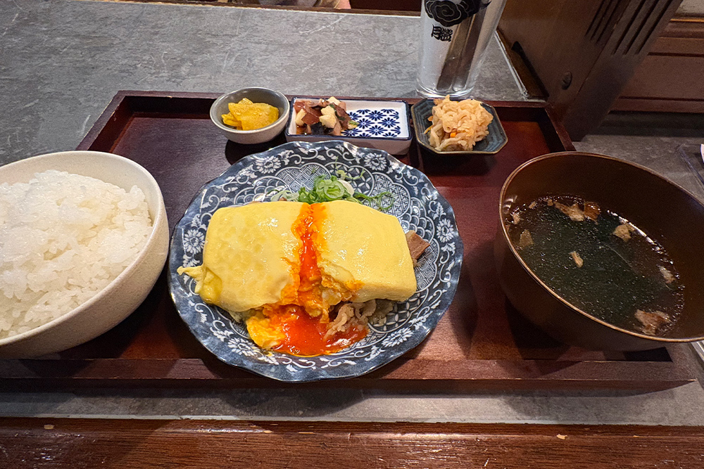 さらに印象的なのが、だし巻きの中に忍ばせた卵黄と、その下に敷かれた牛しぐれ煮。とろりと濃厚な卵黄と、甘辛く炊かれた牛しぐれ煮が合わさることで、出汁のやさしさにコクと奥行きが加わります。添えられたお造りや小鉢、漬物、汁物も一品一品丁寧で、最後まで満足感の高い定食です。