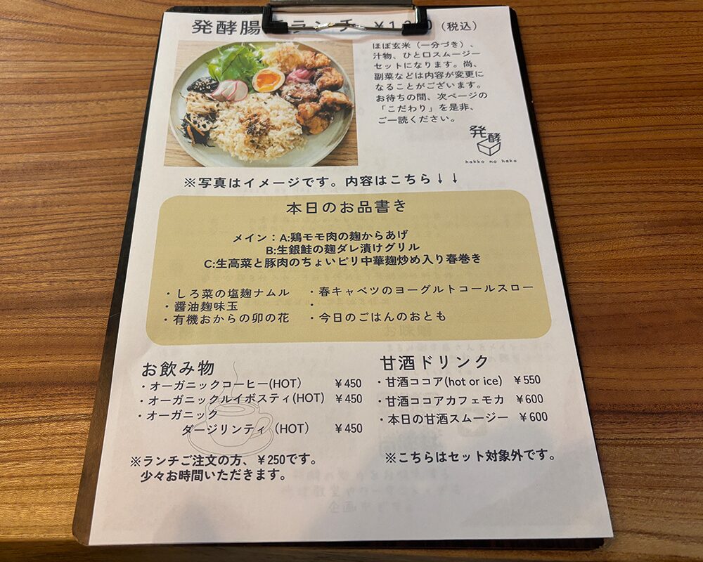 | 店名 | 発酵処 hakko no hako(ハッコウドコロ ハッコウノハコ) |