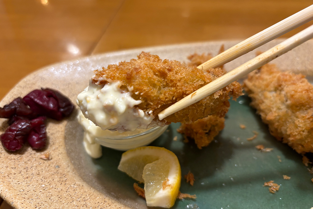 看板メニューは、人気No.1の牛ヘレ&カキフライ定食。運ばれてきた瞬間、まず目を引くのはお皿の大きさと盛りの良さです。サクッと揚がったカキフライは衣が軽く、噛んだ瞬間に心地よい音が広がります。中からは牡蠣の旨みがじゅわっと溢れ、揚げ物でありながら重たさを感じにくいのが印象的です。