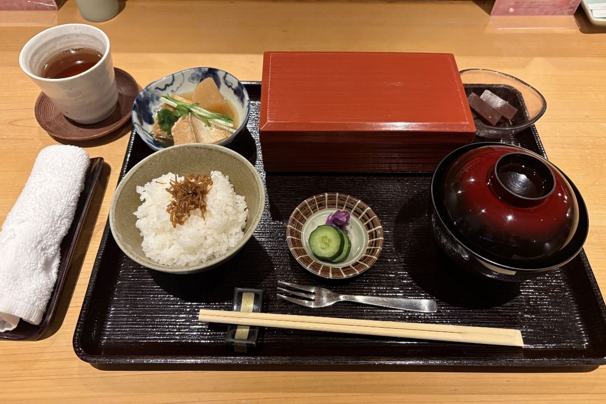 運ばれてくるのは、美しい長手箱に丁寧に盛り付けられた和食の数々。箱の中には、香ばしく揚がった揚げ物やふんわりとしただし巻き卵などが彩りよく並び、見た目からも上品さが伝わってきます。さらに、やさしい味わいの煮物や、ほっとする出汁の香りが広がる味噌汁、ふっくらと炊き上げられたご飯、漬物、そして食後のデザートまで付いています。