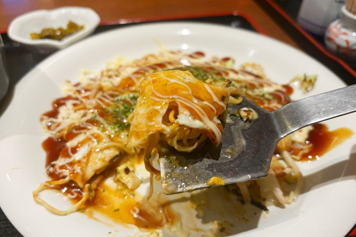 そんな「こんご」でぜひ味わってほしいのが、13時から提供される「広島お好み焼き定食」。運ばれてくるのは、鉄板ではなくお皿で提供されるスタイルのお好み焼きです。薄く焼かれた生地の上に、パリッとした香ばしいそば、そしてしっとり甘みのあるキャベツがたっぷり重なっています。広島お好み焼きの特徴でもあるそばが入っていることで、見た目以上にしっかりとした食べ応えがあり、満足感の高い一品です。さらに、卵もとろっとしていて、全体をやさしくまとめてくれます。