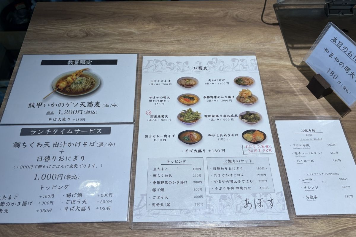 天満橋駅から徒歩1分という好立地にある「あぼす(ABOSU)」。朝から営業している立ち食いそばのお店で、通勤前やランチタイムにも立ち寄りやすい一軒です。注文は先にカウンターで行い、支払い後に番号札を受け取って待つスタイル。呼ばれたら取りに行き、食べ終えたら返却口へ戻すというシンプルな流れで、気軽に利用できるのが魅力です。