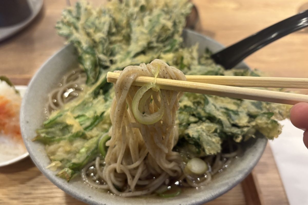 そんな「あぼす」でぜひ味わってほしいのが、「国産春菊天蕎麦」。まず目を引くのは、手のひらほどもある大きな春菊の天ぷら。その迫力ある見た目に思わず驚かされます。ひと口かじると、サクサクと軽やかな食感で、春菊のほろ苦さと香りがふわっと広がります。パリパリと崩しながら食べたり、出汁に少し浸してしっとりとした食感を楽しんだりと、食べ方によって違った美味しさを味わえるのも魅力です。