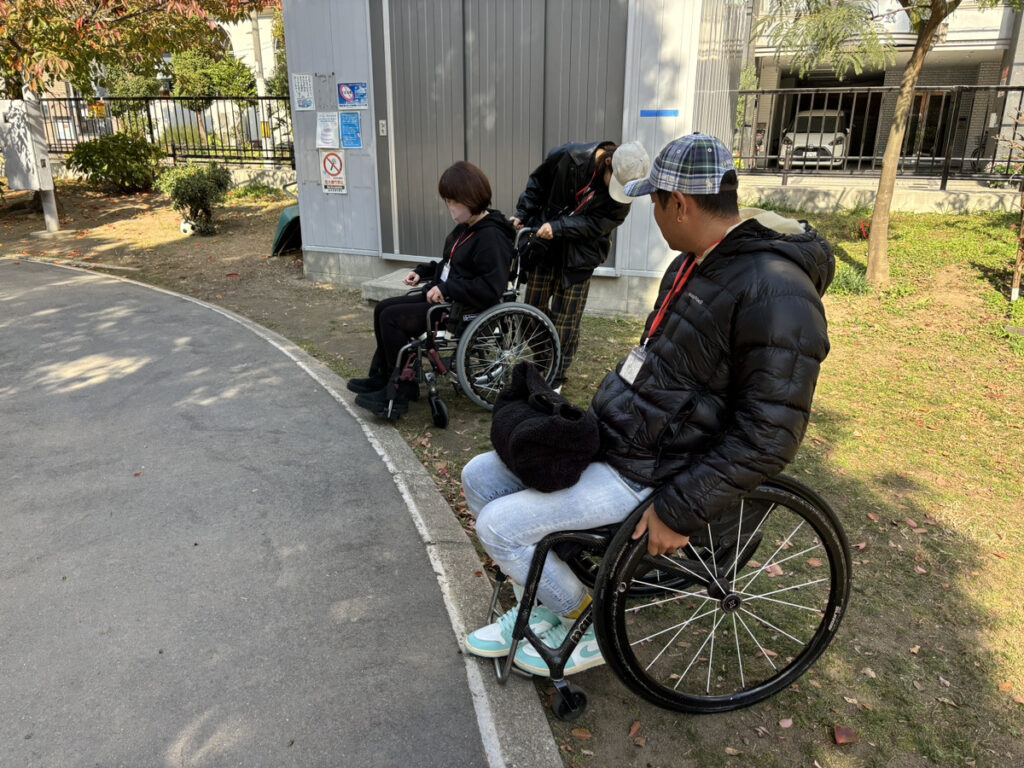 街へ出て進み始めると、参加者の多くがまず感じたのは「スピード感の変化」でした。歩いているときは何気なく通り過ぎる場所も、車いすでは一つひとつ確認しながら進む必要があります。